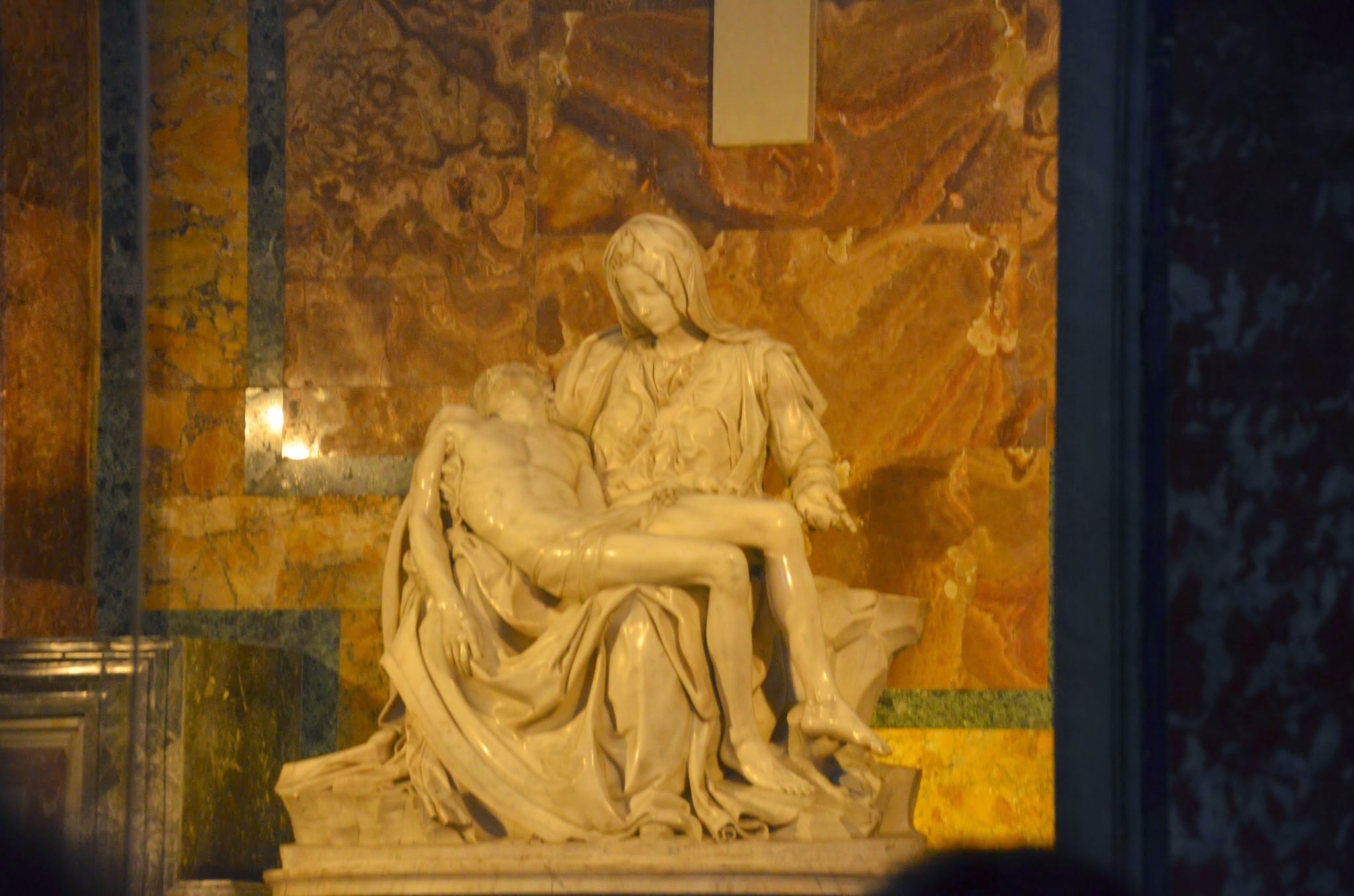 Going to St. Peter’s Basilica in Vatican City is a big deal. We started at the piazza and entered the main Basilica where an Italian mass was taking place in part of the church. Tourists filled the rest of the space and queued up to see the Pieta which is the marble statue of the mourning Virgin Mary holding the crucified Jesus on her lap. It was carved by Michael Angelo from a single block of white Carrera marble (the purest white that can be mined).