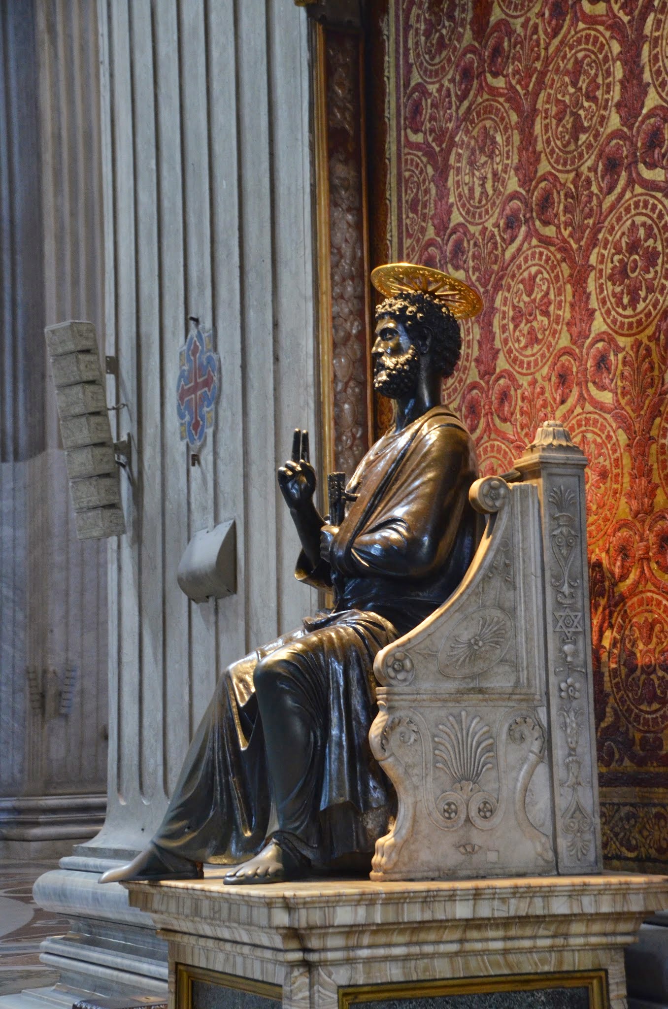 This bronze statue of St. Peter enthroned and with a gold halo has a foot that is extended. Over the years pilgrims touch, rub and kiss the statue in that spot causing it to polish and eventually wear down to a nub. It’s important to note that many depictions of the Saints are symbolic. You can tell which saint is being depicted by what items they are holding. St. Peter carries the keys to the kingdom and in this instance he is enthroned in recognition of his role as the first in a long chain of Popes.