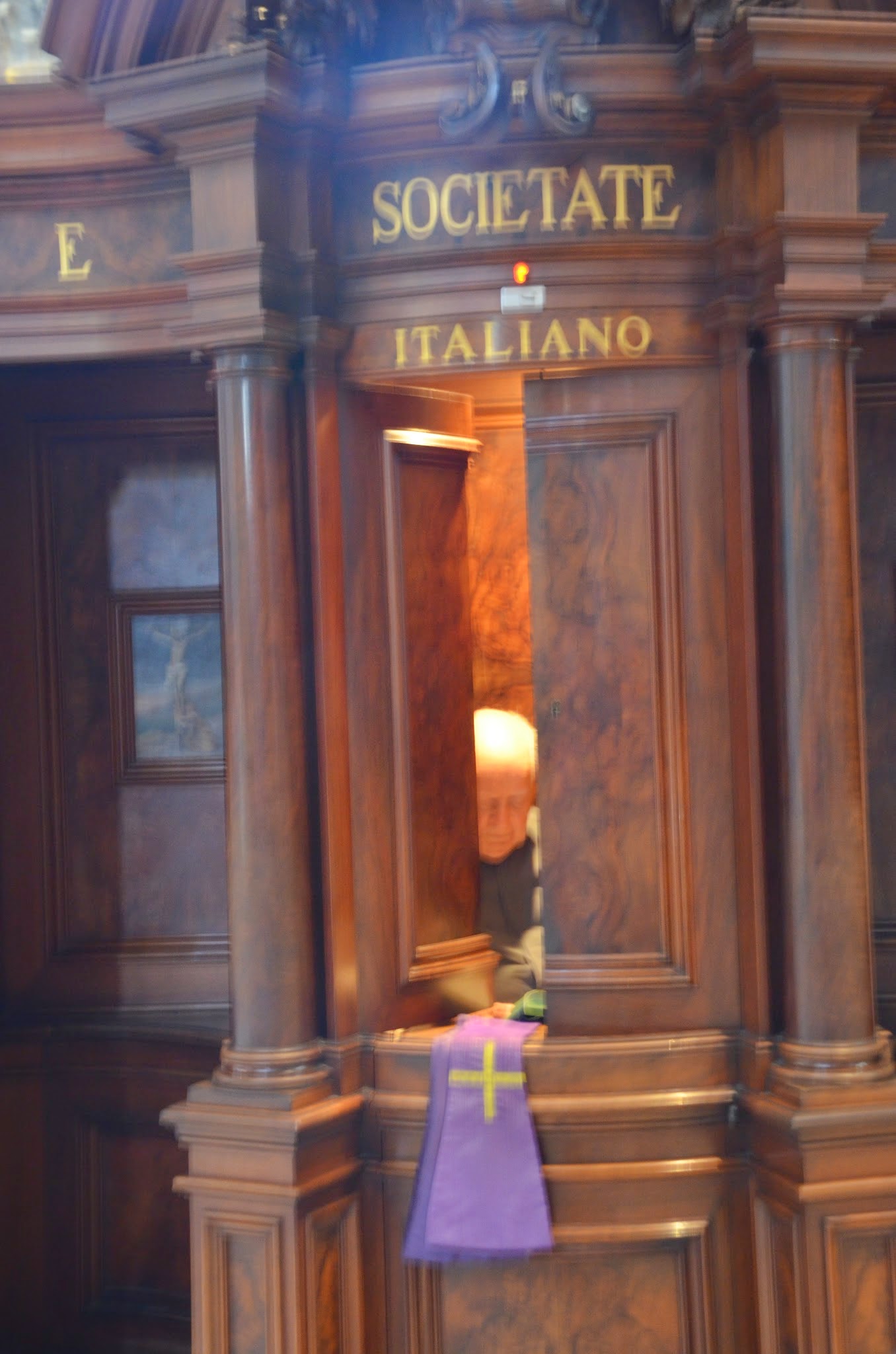 The wooden window marked for the Italian language with the purple stole visible was staffed by a priest for an on-spot confession.