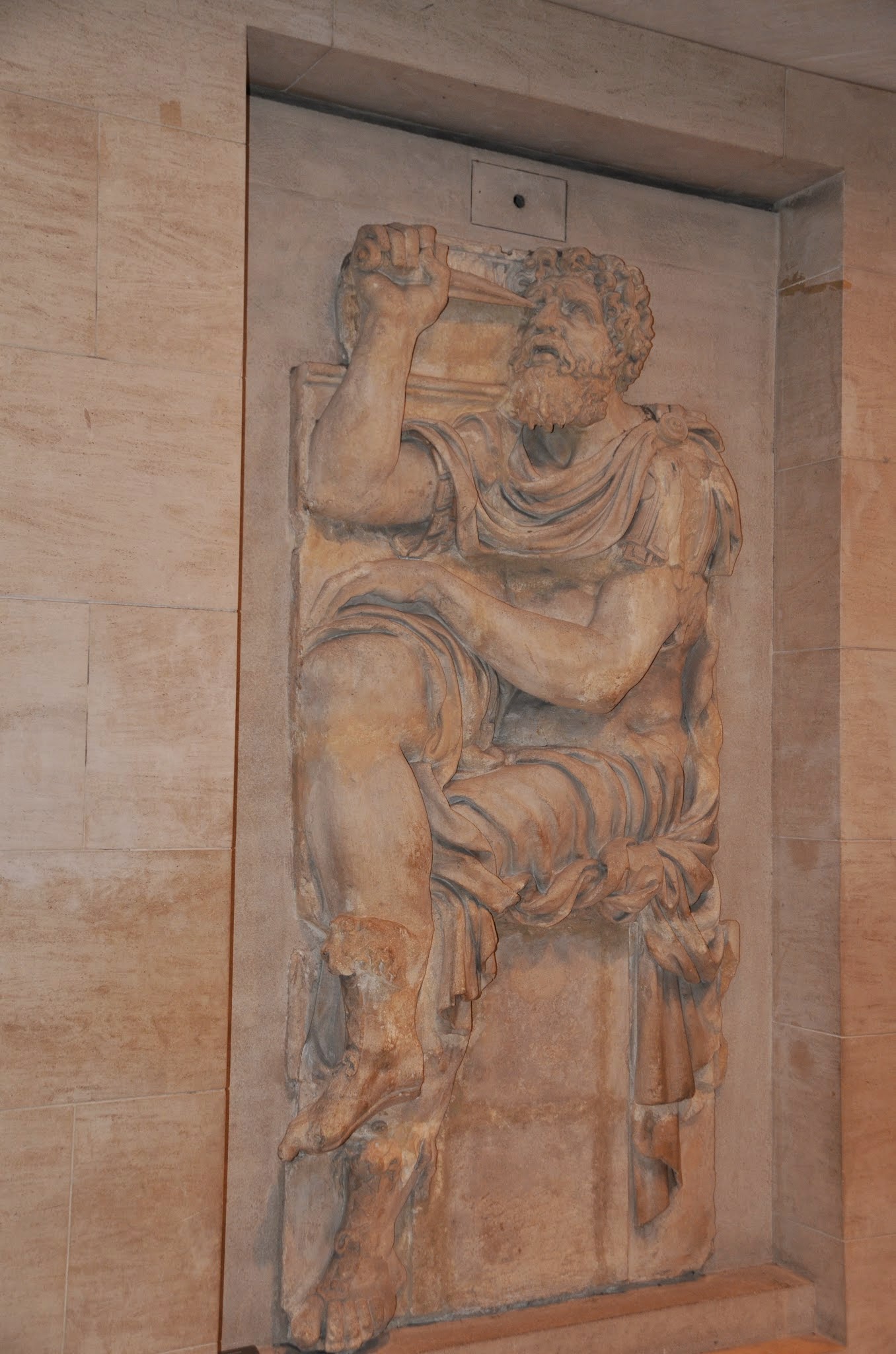 Stone relief “Zaleucus” representing the story of Zaleucus gouging out his eye after having condemned his son to gouge out his other eye for committing the fault of adultery.