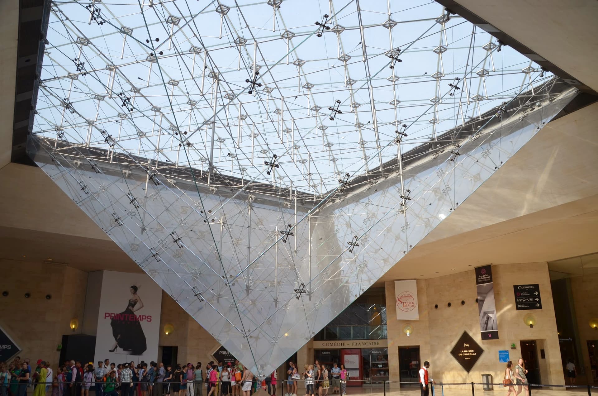 The pyramid is made of glass segments and metal poles, allowing natural light to enter the underground lobby of the museum. It stands about 21.6 meters (71 feet) high and is composed of approximately 673 glass panes.