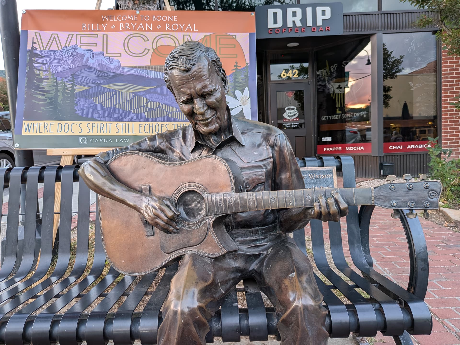 The statue now sits at the corner of King and Howard Streets, a central gathering place in Boone. Over four days I watched individuals, young and old — even entire families — settle in beside Doc for a photo. At one point, a half-dozen musicians formed a jam circle around him, with twenty more listeners spilling onto the busy streets. After a cordial word from the police, the circle shifted a few feet away, and the music carried on.